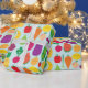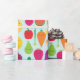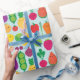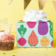 Un motif de fruits et légumes joyeux et colorés sur un arrière - plan bleu, y compris une pêche, banane, ananas, pastèque, poire, cerises, radis, aubergine (aubergine), bruxelles sprout, pois, radis et poivron rouge (poivron).