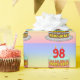 Ce modèle de papier d'emballage à thème d'anniversaire, optimiste et joyeux, présente une représentation en bande dessinée d'un gâteau d'anniversaire à trois niveaux, avec des bougies en forme de chiffres sur le dessus, indiquant le numéro "98", ainsi que le message "HAPPY 98TH BIRTHDAY", et un nom de destinataire personnalisé. L'arrière - plan dispose d'un motif multicolore pastel en arc-en-ciel inspiré du spectre dégradé. Envelopper du papier comme celui-ci peut être une façon amusante d'envelopper un cadeau d'anniversaire ou un cadeau donné à quelqu'un qui célèbre son quatre-vingt-dix-huitième anniversaire. [~Z0000622]