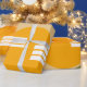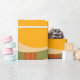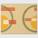 Ce papier d'emballage a un design abstrait moderne du milieu du siècle d'un cercle doré à l'intérieur d'un cercle vert avec des rayures orange et blanche.
