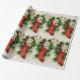 Le papier d'emballage rétro mignon a une carte de Noël vintage avec un petit chaton sucré dans un bas rouge. Le bas est décoré d'un joli arc en satin rouge, de pins et de branches saintes, de baies rouges et de guirlandes de perles.