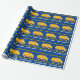 Cool sur mesure pelle de construction anniversaire de fête d'emballage papier pour un enfant qui aime les véhicules de construction jaune en noir et jaune sur papier cadeau bleu. Conception de véhicule amusant pour un petit garçon qui aime les voitures et les camions. Customisez avec le nom de votre enfant et HEUREUX ANNIVERSAIRE en blanc sous le ruban de prudence noir et jaune.