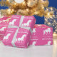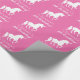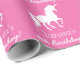 Papier d'emballage personnalisé par licorne blanche rose d'anniversaire de filles. Motif de la silhouette assez blanche d'une licorne sur un arrière - plan de roses indien. Customisez pour changer la couleur d'arrière - plan en n'importe quelle autre couleur. Personnalisé avec le nom de filles d'anniversaire dans la police blanche et son âge. Approvisionnements de partie de licorne d'amusement pour un anniversaire orienté de licorne. www.SamAnnDesigns.com