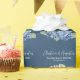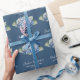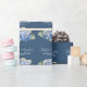 Ce papier d'emballage présente une aquarelle fleurie avec hydrangées bleues sur un arrière - plan bleu marine. Un délicat bouquet de fleurs d'hydrangée est représenté sous les noms d'un couple, suivi d'un échantillon de date et d'emplacement mariage. Vous pouvez personnaliser le papier d'emballage pour inclure vos propres noms ou d'autres textes personnalisés.