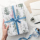Ce papier d'emballage de Noël d'hiver enneigé présente un motif d'hiver d'aquarelle de pins et de branches d'arbres nus.