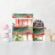 Ce papier d'emballage est composé d'une pagode de style asiatique traditionnelle, rendue dans de délicats traits d'aquarelle, au milieu d'un paysage verdoyant. Le design s'inspire de l'élégance architecturale que l'on retrouve au Japon, en Chine, en Corée et au Vietnam, et qui rend la sérénité de la nature mêlée au patrimoine culturel. Le mélange harmonieux de teintes verdoyantes et de détails complexes évoque un sentiment de tranquillité et d'intemporalité, ce qui en fait une pièce polyvalente pour diverses applications artistiques.