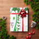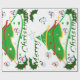 Ce design est orné d'un arbre de Noël vert avec des rubans rouges, dorés et blancs et des boules de Noël ornant l'arbre. Les neigeurs et les saints décorent ce design. "Joyeux Noël" est imprimé sur ce dessin en vert et blanc. Ce papier d'emballage est disponible dans des styles assortis et des coins et bordures colorés.