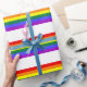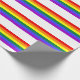 Ce papier d'emballage coloré et personnalisé comporte un motif à bandes arc-en-ciel. Les couleurs arc-en-ciel typiques, rouge, orange, jaune, vert, bleu et violet, sont imprimées dans un motif rayé sur un arrière - plan blanc solide.