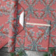Un papier d'emballage de vacances élégant, sophistiqué et festif avec des branches d'épinette bleue et des baies d'ilex rouges en treillis sur un arrière - plan de couleur rouge rosâtre.
