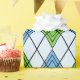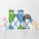 Ce papier d'emballage a un design art déco de formes en diamant fait d'angles superposés en lignes noires colorées dans les tons bleu et vert avec des lignes noires en diagonale donnant l'apparence d'un Jacquard