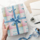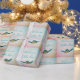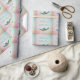 Papier d'emballage pour bébé avec petit dessin de tortue de mer. Customisez le texte en caractères bleus et il sera imprimé dans un motif de haute qualité, enveloppement cadeau sur un rouleau. Les couleurs sont roses et bleues avec du bronzage et une tortue nageant directement chez vous dans chaque carré répétitif.