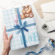 Papier d'emballage en baby shower pastel bleu et blanc doux avec "Baby" avec ours en peluche douce à l'aquarelle. Parfait pour tous vos cadeaux de baby shower.
