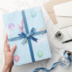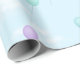Ce design de papier d'emballage joyeux présente des ballons de couleur pastel volant à travers un ciel bleu rempli de nuages blancs duveteux.