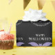 Ce papier d'emballage cadeau personnalisé présente un thème d'Halloween mignon. L'arrière - plan est noir, avec une parties scintillant violette au centre de la zone de texte. L'expression "Happy Halloween" est imprimée en haut dans une police fantaisiste. Un exemple de nom de famille est imprimé en bas, que vous pouvez personnaliser pour inclure votre propre nom ou texte personnalisé.