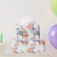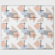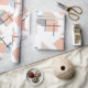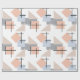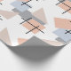 Ce papier d'emballage a une conception Bauhaus de rectangles, carrés, diamants et triangles répétés dans les couleurs de plage de bronze, gris, bleu et orange.