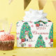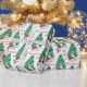 Il y a un adorable chien Beagle brun, noir et blanc qui figure sur ce papier d'emballage de vacances. Le chien porte un chapeau de Père Noël rouge et blanc, et il est assis devant un arbre de Noël décoré. L'image est répétée à travers la surface, et il y a des flocons de neige rouges et des sucres de canne rayés entre les images. Egalement entre les images est un texte rouge qui dit "Joyeux Noël". Les images sont placées sur un arrière - plan blanc.