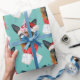 German Shepherd Light Turquoise Christmas Watercolor Chig Breeds présente une belle aquarelle d'un berger allemand avec un Casquette Père Noël rouge et un foulard de Noël rouge, et un arrière - plan turquoise clair avec des étoiles colorées aquarelle.
