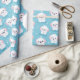 L'image est un motif mignon avec des chiots Bichon Frise souriants sur un arrière - plan bleu avec des accents d'os et d'empreintes de pattes ludiques.