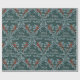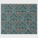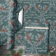 Un papier d'emballage de vacances élégant, sophistiqué et festif avec des branches d'épinette bleu argenté et des baies rouges en treillis sur un arrière - plan vert ardoise profonde avec les mots "Joyeux Noël" écrit dans un brosse en argent écrit à la main dans les fenêtres en treillis.