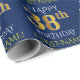 Ce design papier d'emballage comporte un message comme "HAPPY 38th BIRTHDAY", avec le "38th" ayant une apparence fausse/imitation or. Il porte également un nom personnalisé et un arrière - plan de couleur bleue. Il pourrait peut-être être utilisé pour envelopper les cadeaux donnés pour le trente-huitième anniversaire de quelqu’un. [~Z0000135]