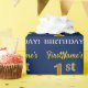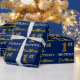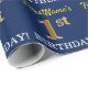 Ce design papier d’emballage comporte un message comme "1er ANNIVERSAIRE de FirstName!", le "1er" ayant une apparence de couleur fausse/imitation or. Le nom peut être customisé, et l'arrière - plan est de couleur bleue. Il pourrait peut-être être utilisé pour envelopper les cadeaux donnés pour le premier anniversaire de quelqu’un. [~Z0000181]