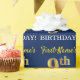 Ce papier d’emballage comporte un message comme "9e anniversaire de prénom!", avec le "9e" qui a une apparence de couleur fausse/imitation or. Le nom peut être personnalisé, et l'arrière - plan est de couleur bleue. Il pourrait peut-être être utilisé pour envelopper les cadeaux donnés pour le neuvième anniversaire de quelqu’un. [~Z0000181]