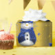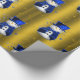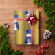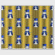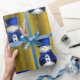 Un joli papier d'emballage de Noël en or coloré avec un motif de petits bonhomme de neige habillé de chapeaux et de gilets en velours bleu, entouré d'étoiles dorées pour donner à votre cadeau d'envelopper cette saison de vacances une touche fantaisiste et élégante.