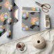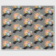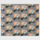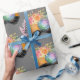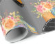 Papier enveloppant avec une aquarelle illustrant un appareil photo orange avec un bouquet floral et une bande de film ondulé noir et blanc.