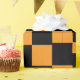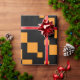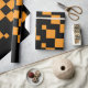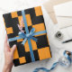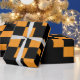 Une boîte cadeau de vacances joliment emballée, ornée d'un arc rouge vif, sur fond festif de branches de pin vert, de pinecones et d'ornements colorés. L'unique papier d'emballage en à damiers noir et orange ajoute une touche moderne à cette scène de Noël traditionnelle, parfaite pour faire un don pendant la saison festive.