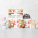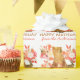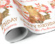 Sur ce joli papier d'emballage d'anniversaire, un gros ours brun tient un joli bouquet de coraux et de fleurs blanches. Derrière lui, il y a un jardin boisé de fleurs, et un petit lapin brun. L'ours sait-il qu'il est là ? Votre texte personnalisé est dans deux champs juste en dessous des images d'ours et de lapin.