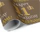Ce design papier d'emballage comporte un message comme "HAPPY 11th BIRTHDAY", avec le "11th" ayant une apparence fausse/imitation or. Il comporte également un nom qui peut être personnalisé, et un arrière - plan de couleur marron. Il pourrait peut-être être utilisé pour envelopper les cadeaux donnés pour le onzième anniversaire de quelqu’un. [~Z0000133]