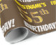 Ce papier d’emballage comporte un message comme "FIRSTNAME’S 55th BIRTHDAY!", avec le "55th" ayant une apparence de couleur fausse/imitation or, et avec le nom et "BIRTHDAY" dans une police amusante et audacieuse. Le nom peut être personnalisé, et l'arrière - plan est de couleur marron. Un papier comme celui-ci pourrait peut-être être utilisé pour envelopper les cadeaux d'anniversaire donnés à quelqu'un pour célébrer son cinquante-cinquième anniversaire. [~Z0000211]
