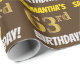 Ce design papier d’emballage comporte un message comme "63e anniversaire de SAMANTHA!", avec le "63e" ayant une apparence de couleur fausse/imitation or, et avec le nom et "anniversaire" dans une police amusante et audacieuse. Le nom peut être personnalisé, et l'arrière - plan est de couleur marron. Un papier comme celui-ci pourrait peut-être être utilisé pour envelopper les cadeaux d'anniversaire donnés à quelqu'un pour célébrer leur soixante-troisième anniversaire. [~Z0000211]