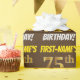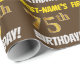 Ce papier d’emballage comporte un message comme "FIRST-NAME’S 75th BIRTHDAY!", avec le "75th" ayant une apparence de couleur fausse/imitation or, et avec le nom et "BIRTHDAY" dans une police amusante et audacieuse. Le nom peut être personnalisé, et l'arrière - plan est de couleur marron. Un papier comme celui-ci pourrait peut-être être utilisé pour envelopper les cadeaux d'anniversaire donnés à quelqu'un pour célébrer leur soixante-quinzième anniversaire. [~Z0000211]