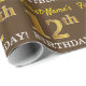 Ce design papier d’emballage comporte un message comme "12e anniversaire de prénom!", le "12e" ayant une apparence de couleur fausse/imitation or. Le nom peut être customisé, et l'arrière - plan est de couleur marron. Il pourrait peut-être être utilisé pour envelopper les cadeaux donnés pour le douzième anniversaire de quelqu’un. [~Z0000180]