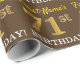 Ce papier d’emballage comporte un message comme "71e ANNIVERSAIRE du prénom!", avec le "71e" ayant une apparence de couleur fausse/imitation or. Le nom peut être customisé, et l'arrière - plan est de couleur marron. Il pourrait peut-être être utilisé pour envelopper les cadeaux donnés pour le soixante-et-onzième anniversaire de quelqu’un. [~Z0000180]