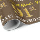 Ce papier d’emballage comporte un message comme "91e ANNIVERSAIRE du prénom !", avec le "91e" ayant une apparence de couleur fausse/imitation or. Le nom peut être personnalisé, et l'arrière - plan est de couleur marron. On pourrait peut-être l’utiliser pour envelopper les cadeaux donnés pour le quatre-vingt-dix et-unième anniversaire de quelqu’un. [~Z0000180]