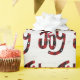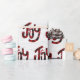 Le casquette du Père Noël sur le buffle rouge et noir plaid JOY dans un style de police amusant sur du bois blanc chaulé avec des flocons de neige.