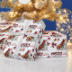 Le motif répété sur ce papier d'emballage de Noël est l'image d'un beau chien sibérien Husky portant un chapeau de Père Noël rouge et blanc, avec un coussin de buffle noir et rouge derrière lui, et un paquet cadeau coordonné avec un ruban d'or à côté de lui. Il y a aussi un arc en plaid de buffle et le texte correspondant qui dit "JOY". Stylisé rouge et noir buffle texte plaid dit MERRY CHRISTMAS", et votre propre signature est dans deux champs pour vous de customiser.