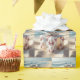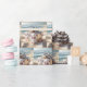 Un cadeau joliment emballé, orné de motifs d'étoiles de mer, est posé sur le sable doré d'une plage, avec de douces vagues de l'océan qui tapissent l'arrière - plan