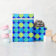 Un rouleau de luxueux Papier à envelopper, avec une grille motif de cercles en turquoise et vert néon sur un arrière - plan bleu vif. Une partie de la collection Posh & Painterly 'Blue Moons'; d'un collage de papier peint à la main par Judy Adamson.