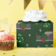 Ce papier d'emballage de Noël à thème de chasse à neige présente des illustrations d'une camionnette avec une charrue sur elle décorée d'une couronne de Noël festive. Les graphiques sont placés contre un arrière - plan vert foncé qui est accentué avec des illustrations d'arbres recouverts de neige et de flocons de neige.
