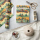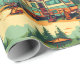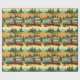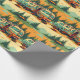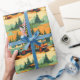 Emballage cadeau d'anniversaire dans des couleurs vintages vert, bronzé et orangé enveloppement cadeau avec campeurs RV et pins.