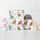 Un papier d'emballage avec une variété d'oiseaux dessinés dans le stylo et l'encre avec l'aquarelle. Les oiseaux comprennent des cardinaux, des poulets, des moucherons et des bleuets.
