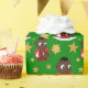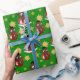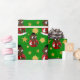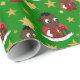 Papier d'emballage de Noël avec l'illustration d'un joli bébé noir souriant, jeune fille ou garçon, le bébé porte des vêtements rouges et blancs et tient un cadeau ; avec un modèle texte modifiable pour votre nom ou message, Noël vacances design avec un arrière - plan vert transparent avec étoiles