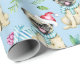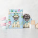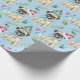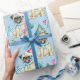 Cet adorable papier d'emballage de Noël de Carlins est parfait pour tout cadeau de Noël. Un arrière - plan bleu clair avec d'adorables carlins habillés de chapeaux de Père Noël et d'arbres de Noël.