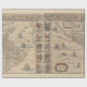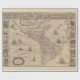 Ce dessin présente une carte des Amériques (y compris les régions occupées par les pays modernes des États-Unis, du Canada, du Mexique, du Brésil et d'autres nations d'Amérique latine et des Caraïbes) créée par le cartographe néerlandais Willem Blaeu (1571-1638), qui a été initialement publiée en 1617. Le titre latin de la carte est "Americae Nova Tabula", ce qui signifie "Nouvelle carte des terres américaines". La carte de Blaeu représente l'état incomplet et imparfait de la connaissance géographique au moment où elle a été produite, cependant, à bien des égards, elle est étonnamment exacte : par exemple, elle montre correctement la Terre de Feu à la pointe de l'Amérique du Sud en tant qu'île. (Une expédition hollandaise sous Willem Cornelisz Schouten et Jacob le Maire venait de contourner le monde en 1615-1616 et avait découvert un nouveau passage, le détroit du Maire, présenté sur la carte comme "Fretum le Maire", au sud du détroit de Magellan, qui prouvait que la Terre de Feu était en effet une île.)