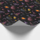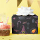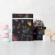 Papier d'emballage cadeau casquette aux sorcières Dark Halloween. La couleur noire de l'arrière - plan peut être changée en n'importe quelle couleur. Des lanternes et des sorcières brument autour des casquettes de sorcières.