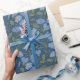 Ce papier d'emballage présente un motif de fleurs bleues à la perwinkle avec des feuilles verts dressés contre un arrière - plan bleu marine pour un look joli et moderne.