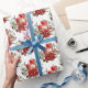 Papier enveloppant avec un joli bouquet en aquarelles. Bougies rouges aux accents dorés et bougie blanche plus petite aussi. Entouré d'un bouquet de pins avec une fleur de poinsettia.