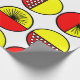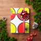 Ce papier d'emballage a un design moderne du milieu du siècle de demi-cercles, certains avec des éclats d'étoile, certains avec de petits cercles, et d'autres simplement solides, en rouge et jaune.